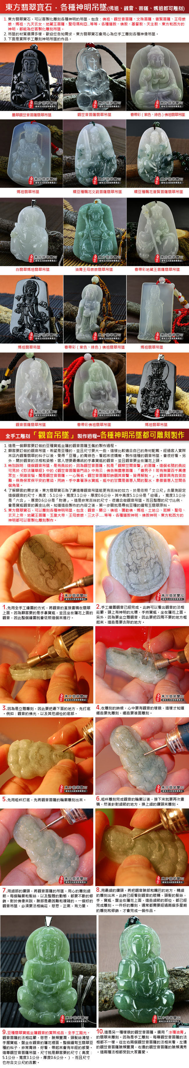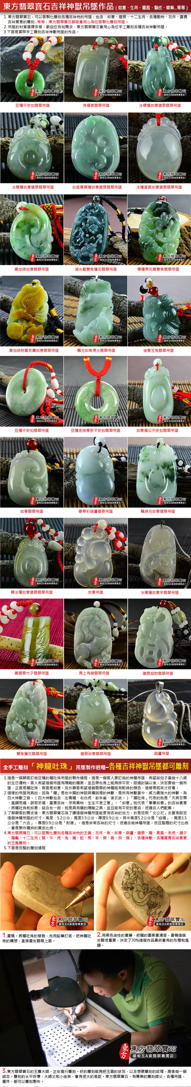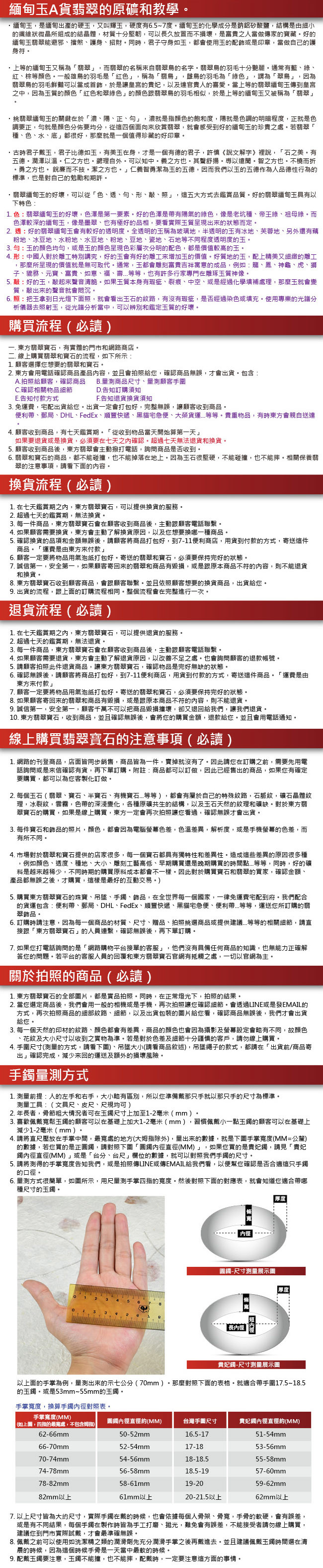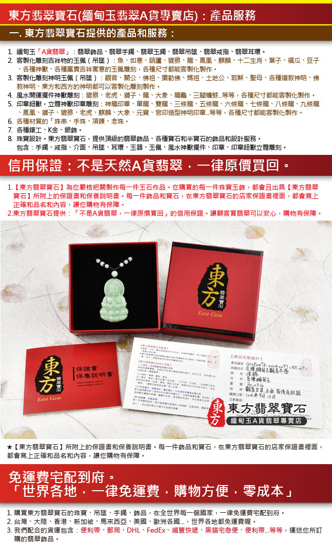 商品規格 1.產品名稱:釋迦牟尼佛A貨翡翠玉墜墜子一只 2.尺寸:長約3.5公分x寬約2.6公分 3.厚度:約0.6公分 4.重量(克):約11.38克 5.證書:玉石保證書和店家保證書 6.商品編號:FD-071 體驗說明 使用方法說明 無 注意事項 1.網路的刊登商品,店面皆同步銷售,商品皆為一件,賣掉就沒有了。因此請您在訂購之前,需要先用電話詢問或是來信確認有貨,再下單訂購。附註:商品都可以訂做,因此已經售出的商品,如果您有確定要購買,都可以為您客製化訂做。 2.每個玉石(翡翠、寶石、半寶石、有機寶石...等等),都會有屬於自己的特殊紋路,石脈紋,礦石晶體紋理,冰裂紋,雲霧,色帶的深淺變化,各種原礦共生的結構,以及玉石天然的紋理和礦缺。對於東方翡翠寶石的購買,如果是線上購買,東方一定會再次拍照讓您看過,確認無誤才會出貨。 3.每件寶石和飾品的照片,顏色,都會因為電腦螢幕色差,色溫差異,解析度,或是手機螢幕的色差,而有所不同。對於細節要求的顧客,請勿在網站上下單,建議您要實際拿在手上親自挑選,這樣才能挑出您要的珠寶和飾品。 4.市場對於翡翠和寶石提供的店家很多,每一個寶石都具有獨特性和差異性。造成這些差異的原因很多種,例如顏色、透度、種地、大小、雕刻工藝高低、早期購買還是晚期購買的時間點...等等,同時,好的礦料是越來越稀少,不同時期的購買原料成本都會不一樣。因此對於購買寶石和翡翠的買家,都建議要確認清楚,金額、產品都無誤之後,才購買,這樣是最好的互動交易。 5.購買東方翡翠寶石的珠寶、吊墜、手鐲、飾品,在全世界每一個國家,一律免運費宅配到府。我們配合的貨運包含:便利帶、郵局、DHL、FedEx、順豐快遞、黑貓宅急便、便利帶...等等,運送您所訂購的翡翠飾品。 6.在七天鑑賞期之內,東方翡翠寶石,可以提供換貨的服務。 7.超過七天的鑑賞期,無法換貨。 8.每一件商品,東方翡翠寶石會在顧客收到商品後,主動跟顧客電話聯繫。 9.如果顧客需要換貨,東方會主動了解換貨原因,以及您想要換哪一種商品。 10.確認換貨的品項和金額無誤後,請顧客將商品打包好,到7-11便利商店,用貨到付款的方式,寄送這件商品。「運費是由東方來付款」 11.顧客一定要將物品用氣泡紙打包好。寄送的翡翠和寶石,必須要保持完好的狀態。 12.誠信第一,安全第一,如果顧客寄回來的翡翠和商品有毀損,或是跟原本商品不符的內容,則不能退貨和換貨。 13.東方翡翠寶石收到顧客商品,會跟顧客聯繫。並且依照顧客想要的換貨商品,出貨給您。 14.出貨的流程,跟上面的訂購流程相同。整個流程會在完整進行一次。 |